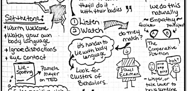 Brooke Baldwin gave this presentation which focused on gestures, movements and mannerisms. Reading body language is really just about listening and watching the things that we naturally do, its just a matter of spotting the clusters of behaviors. Baldwin gave a couple good tips for facilitators, such as chair position, and watching your own body language. She noted the popular TV show Lie to Me which successfully demonstrated many principles of reading body language and recommended the TED talk How to Spot a Liar by Pamela Meyer.